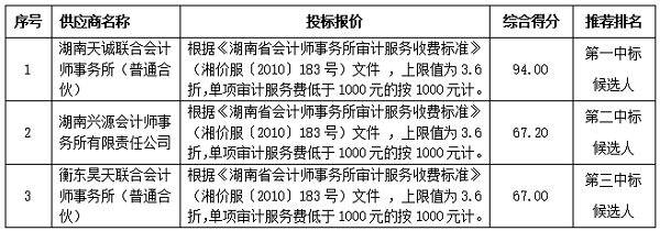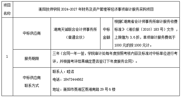 衡陽技師學院2024-2027年財務及資產管理等經濟事項審計服務采購項目院內自主招標于2024年4月15日結束,現將中標結果公告如下: