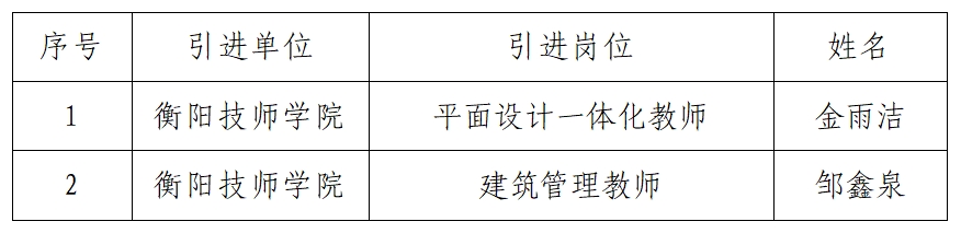 根據《2024年衡陽技師學院急需緊缺專業技術人才引進公告》的規定,經報名、資格審查、考試考核、體檢、考察等程序,確定金雨潔、鄒鑫泉同志為擬聘用人員,現予以公示。