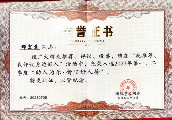 光榮入選2023年第一、二季度“助人為樂·衡陽好人榜”