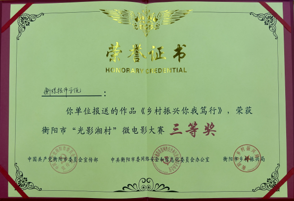 11月8日,從衡陽市“光影湘村”微電影大賽頒獎儀式上傳來喜訊,衡陽技師學院拍攝的作品《鄉村振興 你我篤行》榮獲大賽三等獎。