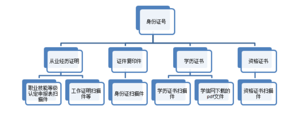 (3)將職業技能等級認定申報表掃描件、工作證明掃描件及社保證明(圖片大小小于5MB)存放在子文件夾“從業經歷證明”下;學歷證書掃描件、學信網下載的pdf文件放在子文件夾“學歷證書”下;等級證書或資格證書掃描件放在子文件夾“資格證書”下,身份證掃描件存放在子文件夾“證件復印件“下,掃描件都是指以jpg格式保存的。
