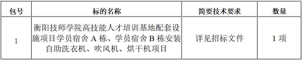 采購項目名稱:衡陽技師學(xué)院高技能人才培訓(xùn)基地配套設(shè)施項目學(xué)員宿舍A棟、學(xué)員宿舍B棟安裝自助洗衣機、吹風(fēng)機、烘干機項目