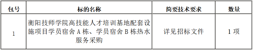 采購項(xiàng)目名稱:衡陽技師學(xué)院高技能人才培訓(xùn)基地配套設(shè)施項(xiàng)目學(xué)員宿舍A棟、學(xué)員宿舍B棟熱水服務(wù)采購項(xiàng)目
