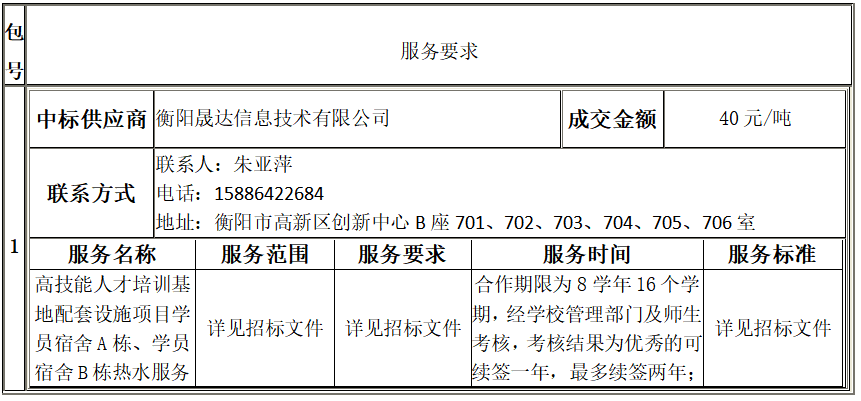 衡陽技師學(xué)院高技能人才培訓(xùn)基地配套設(shè)施項(xiàng)目學(xué)員宿舍A棟、學(xué)員宿舍B棟熱水服務(wù)采購項(xiàng)目公開招標(biāo)采購于2024年07月03日結(jié)束,現(xiàn)將中標(biāo)(成交)結(jié)果公告如下: