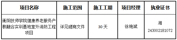 衡陽技師學院健康養老服務產教融合實訓基地室外消防工程項目于2025年07月10日結束,現將成交結果公告如下: