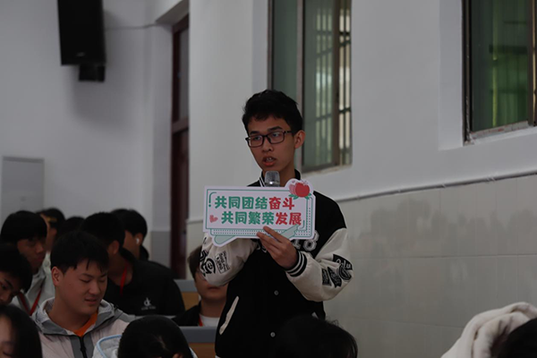 來自新疆的維吾爾族學(xué)生阿曼尼沙分享了自己在校學(xué)習(xí)的故事,并立志回鄉(xiāng)成為“數(shù)字牧羊人”,用電商帶領(lǐng)鄉(xiāng)親們致富的夢想。22電商高技3班學(xué)生劉馨從一顆石榴說起,講述了校園里各民族同學(xué)互幫互助、親如一家的溫暖點(diǎn)滴。她們用最真實(shí)的聲音展現(xiàn)了新時(shí)代青年對民族團(tuán)結(jié)的深刻理解和自覺擔(dān)當(dāng),引發(fā)了全場師生的共鳴。