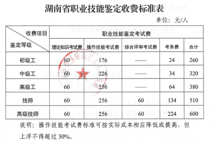 根據(湘人社規[2024] 3號)文件精神,我院職業技能等級認定收費按以下標準收取。