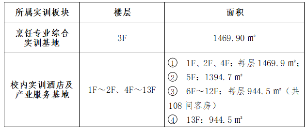 本次共建的酒店及烹飪專業(yè)綜合實(shí)訓(xùn)基地,總建筑面積合計(jì)14830.3㎡(設(shè)計(jì)圖標(biāo)示面積),具體布局(見附件1:綜合培訓(xùn)中心建筑平面設(shè)計(jì)圖)、面積及所屬實(shí)訓(xùn)板塊如下: