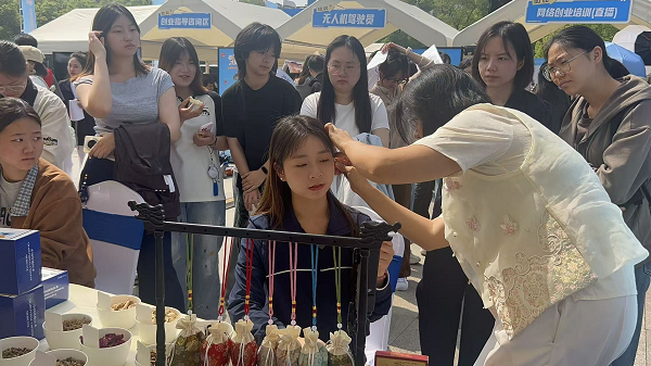 4月18日,“智匯瀟湘 才聚湖南”2026年湖南省促進高校畢業生就業創業專場招聘活動(湘南片區)暨“湘才留湘”生物醫藥衛生專場招聘活動在衡陽舉行。衡陽技師學院經貿旅游學院師生在招聘活動養生保健體驗區展現技能風采。