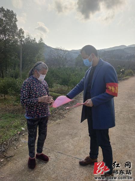 圖為衡陽技師學(xué)院駐靈官鎮(zhèn)興龍村駐村工作隊(duì)隊(duì)員唐濤向村民發(fā)放防控疫情宣傳資料