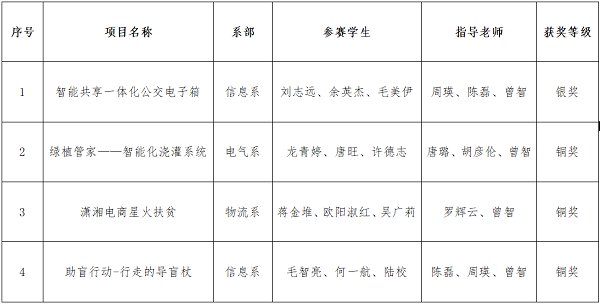 經(jīng)校賽遴選、資格審查、專家盲審等環(huán)節(jié)后,全省共498件作品入圍決賽。我院的《智能共享一體化公交電子箱》項目奪得銀獎,《綠植管家——智能化澆灌系統(tǒng)》《瀟湘電商星火扶貧》《助盲行動-行走的導(dǎo)盲杖》3個項目榮獲銅獎。