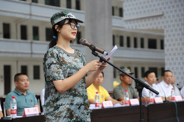 參訓學生代表2020廣告技師班陶宇靚同學上臺發言,表達了堅持訓練,認真接受國防教育的決心。承諾軍訓期間學習軍人的愛國風采,傳承軍人的吃苦精神,練就軍人的錚錚傲骨,迎難而上,磨煉意志,向學校、教官、向親人送上一份滿意的答卷。
