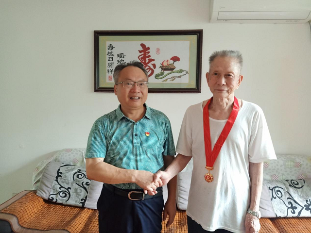 黨委副書記劉金春來到老黨員倪肇文家中,詳細(xì)了解老人的家庭、生活、身體等情況,并叮囑其家人多關(guān)心和照顧好老人。老人的兒子倪繼黨也是51年黨齡的老黨員,劉金春為他們父子佩戴“光榮在黨50年”紀(jì)念章。