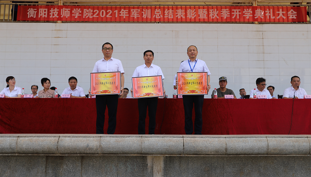 黨委副書記劉金春宣讀了本次軍訓中獲獎的集體和個人名單,主席臺就座的領導依次給優秀標兵、優秀教官、優秀指導員、優勝連隊及先進營頒獎。