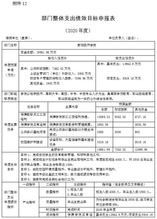 (六)預(yù)算績效目標(biāo)說明:本部門整體支出和項(xiàng)目支出實(shí)行績效目標(biāo)管理,納入2020年部門整體支出績效目標(biāo)的金額為19861.98萬元,其中,基本支出13942.8萬元,項(xiàng)目支出5919.18萬元。