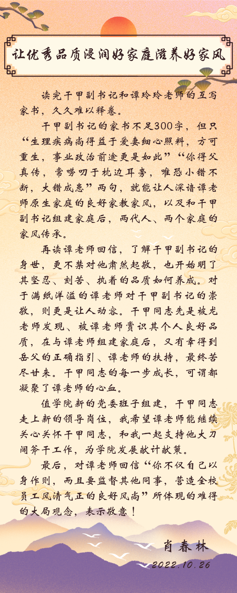清廉學校——書記、院長評家書(一)|黨委書記肖春林同志評家書:讓優秀品質浸潤好家庭滋養好家風