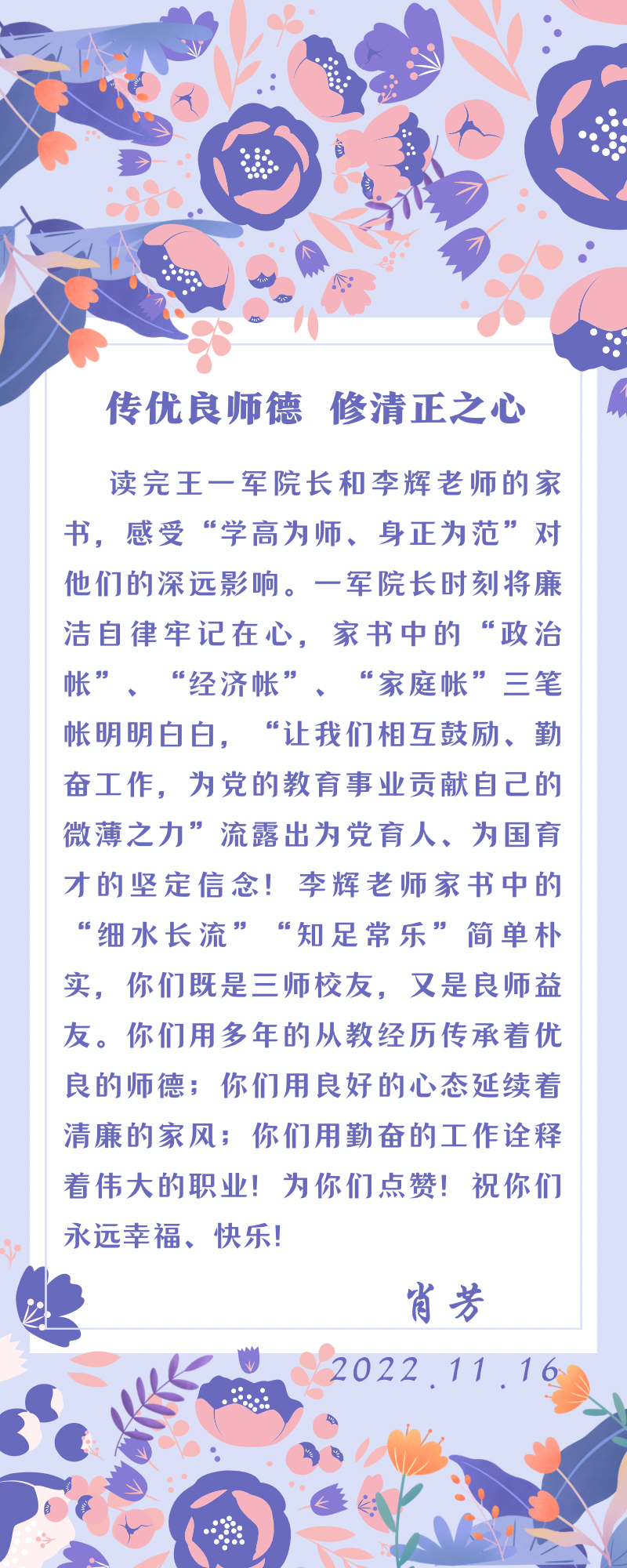 清廉學校——書記、院長評家書(六)|副院長肖芳同志評家書:傳優(yōu)良師德 修清正之心