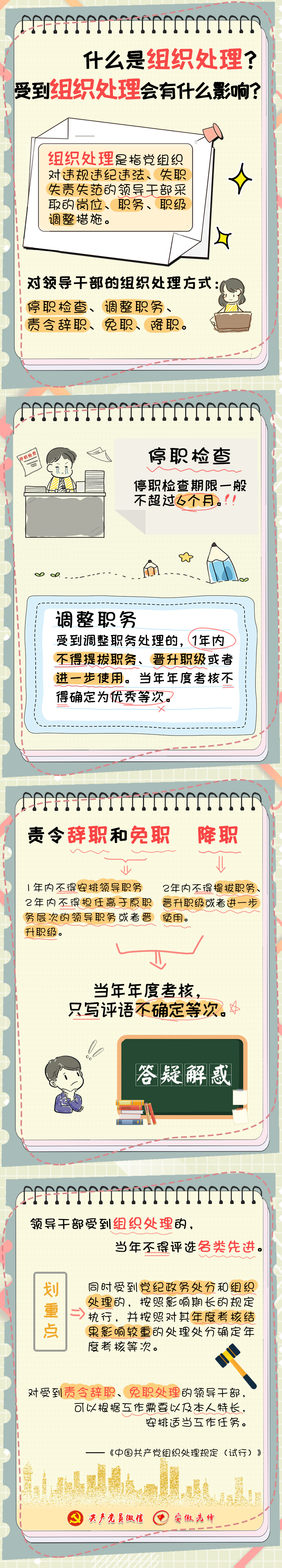 第三條 本規定所稱組織處理,是指黨組織對違規違紀違法、失職失責失范的領導干部采取的崗位、職務、職級調整措施,包括停職檢查、調整職務、責令辭職、免職、降職。
