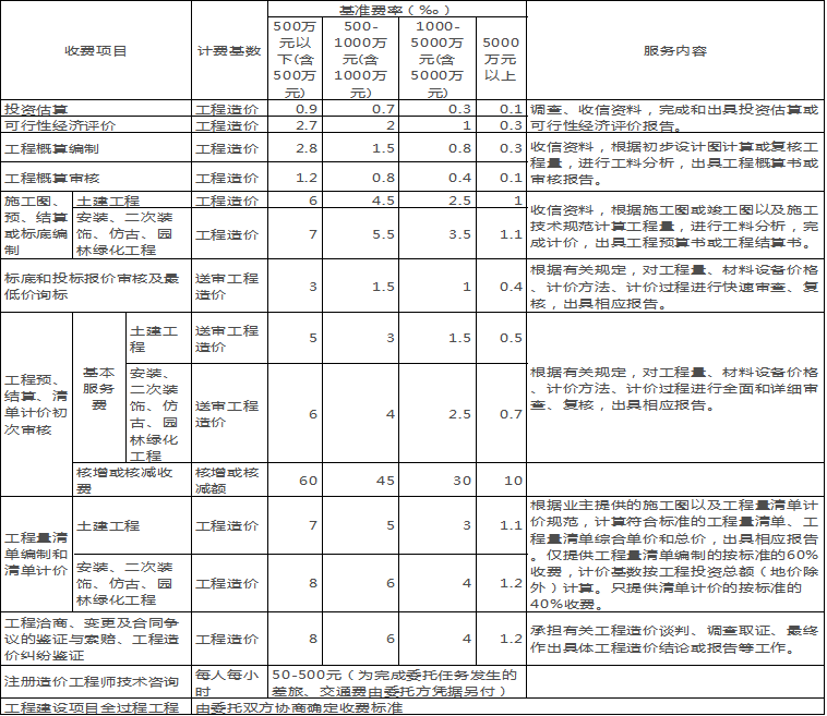 注:1、上表收費實行差額定率累進(jìn)計費,低于1000元的按1000元。計費方式舉例如下:某土建工程施工圖預(yù)算編制的工程造價為5000萬,計算服務(wù)費為:500萬元*6‰+(1000-500)萬元*4.5‰+(5000-1000)萬元*2.5‰=15.25萬元;