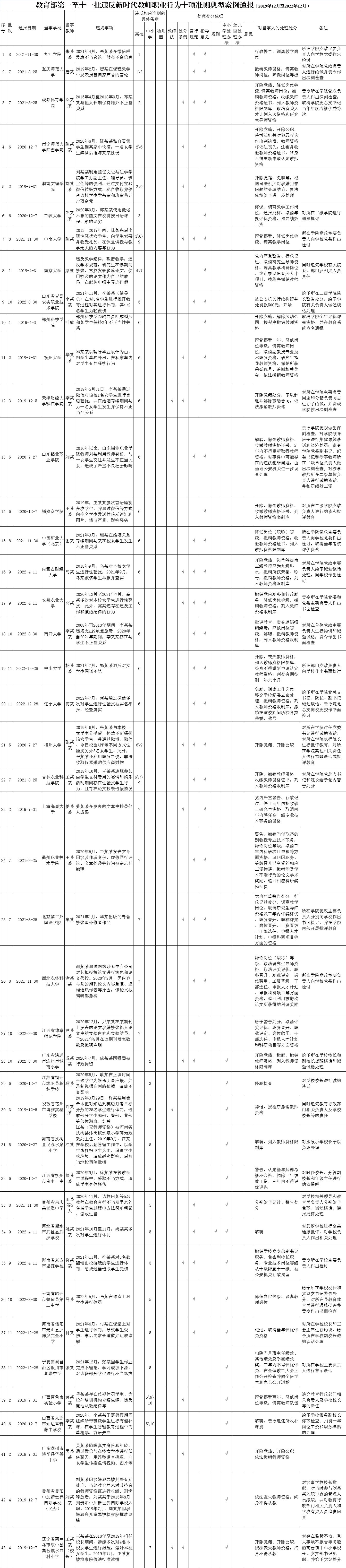 教育部第一至十一批違反新時代教師職業行為十項準則典型案例通報(2019年12月至2022年12月)