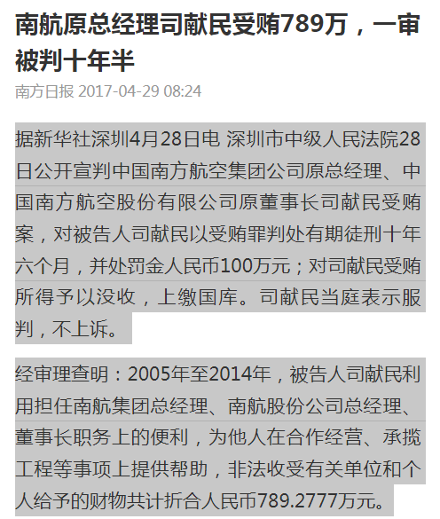 【解說詞】2014年11月至12月,中央第一巡視組對南航集團(tuán)進(jìn)行專項(xiàng)巡視。南航集團(tuán)原黨組副書記、總經(jīng)理司獻(xiàn)民,因巡視發(fā)現(xiàn)的問題線索被立案審查。2017年4月,司獻(xiàn)民因受賄罪被判處有期徒刑十年零六個(gè)月。