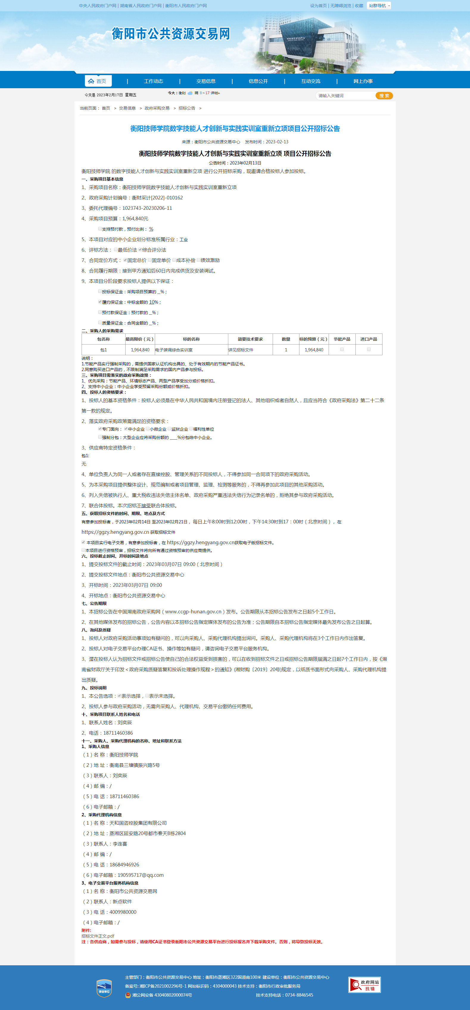 衡陽技師學院數字技能人才創新與實踐實訓室重新立項項目公開招標公告