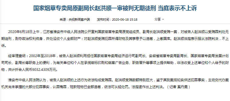 【解說詞】這種心癮,或許比酒癮更難戒斷。黨的十八大之后,趙洪順雖然有時也擔驚受怕,但酒局還是忍不住要去。喝酒止不住,酒局背后的權錢交易自然也止不住。經查,趙洪順利用職務便利,為有關單位和個人在承攬煙標印刷和煙草廣告業務、職務晉升等事項上提供幫助,收受賄賂9000多萬元,2020年6月,趙洪順被判處無期徒刑,沒收個人全部財產。