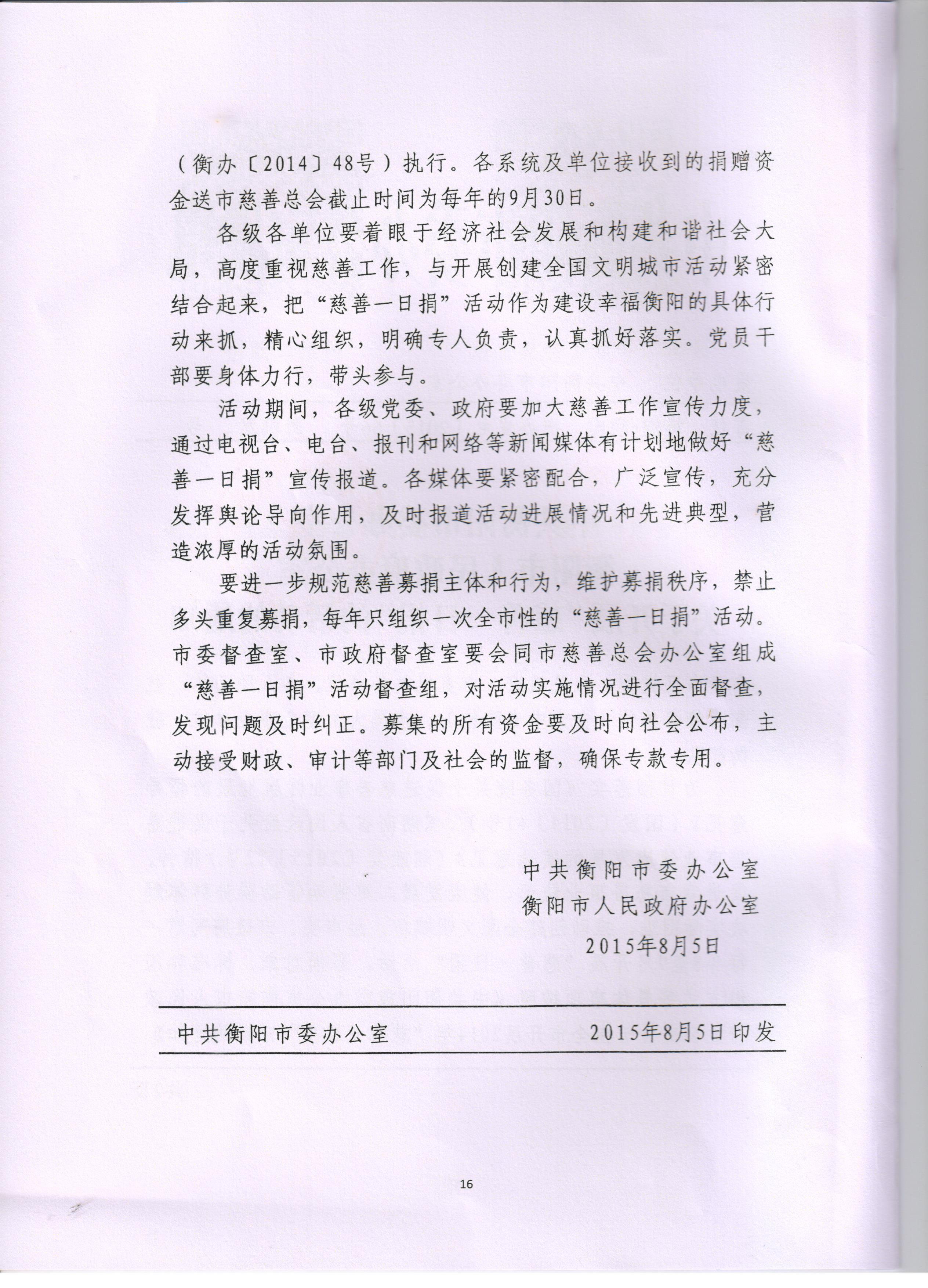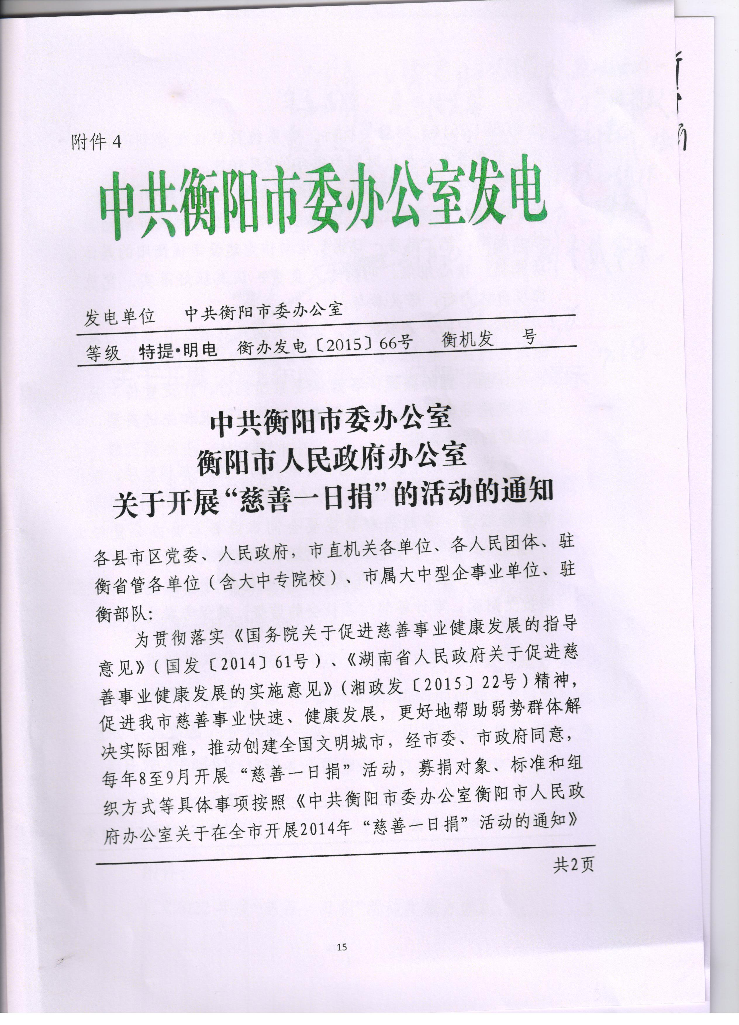中共衡陽市委辦公室衡陽市政府辦公室關于開展“慈善一日捐”的活動的通知