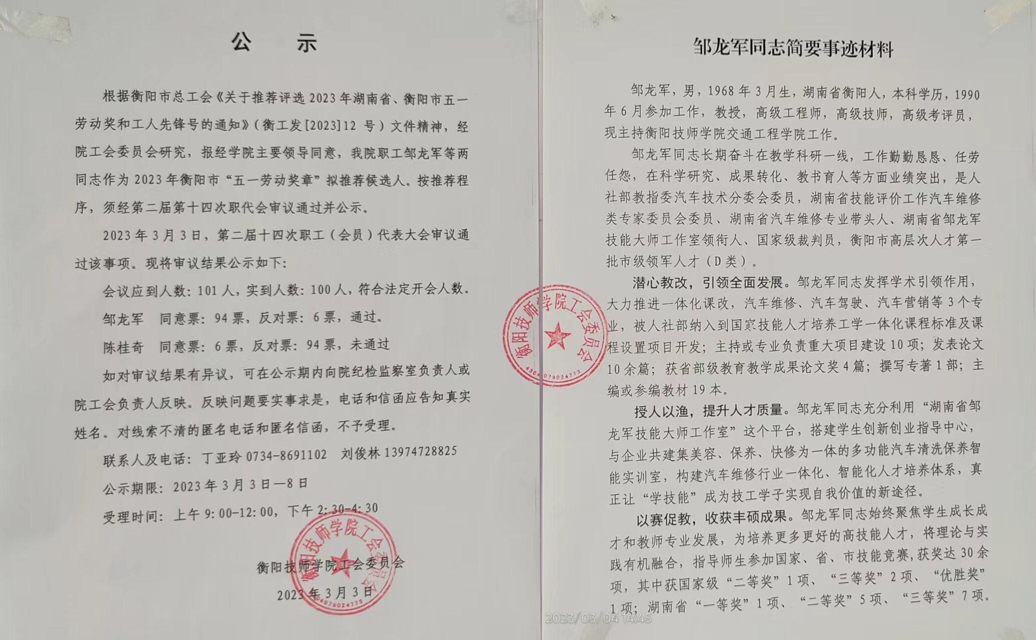 衡陽技師學院2023年衡陽市五一勞動獎章擬推薦候選人公示