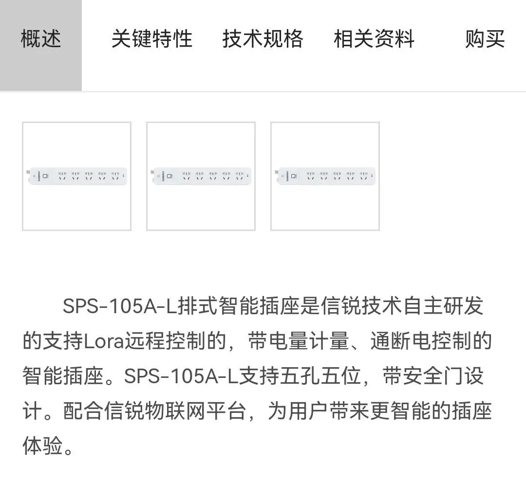 SPS105A-L智能用電管理設(shè)備廠家官網(wǎng)顯示,這是一款具有電量計(jì)量、通斷電控制功能的“排式智能插座”,支持五孔五位,帶安全門設(shè)計(jì),配合物聯(lián)網(wǎng)平臺(tái)使用,可通過app遠(yuǎn)程控制,在大功率或突增功率下自動(dòng)斷電和警告。