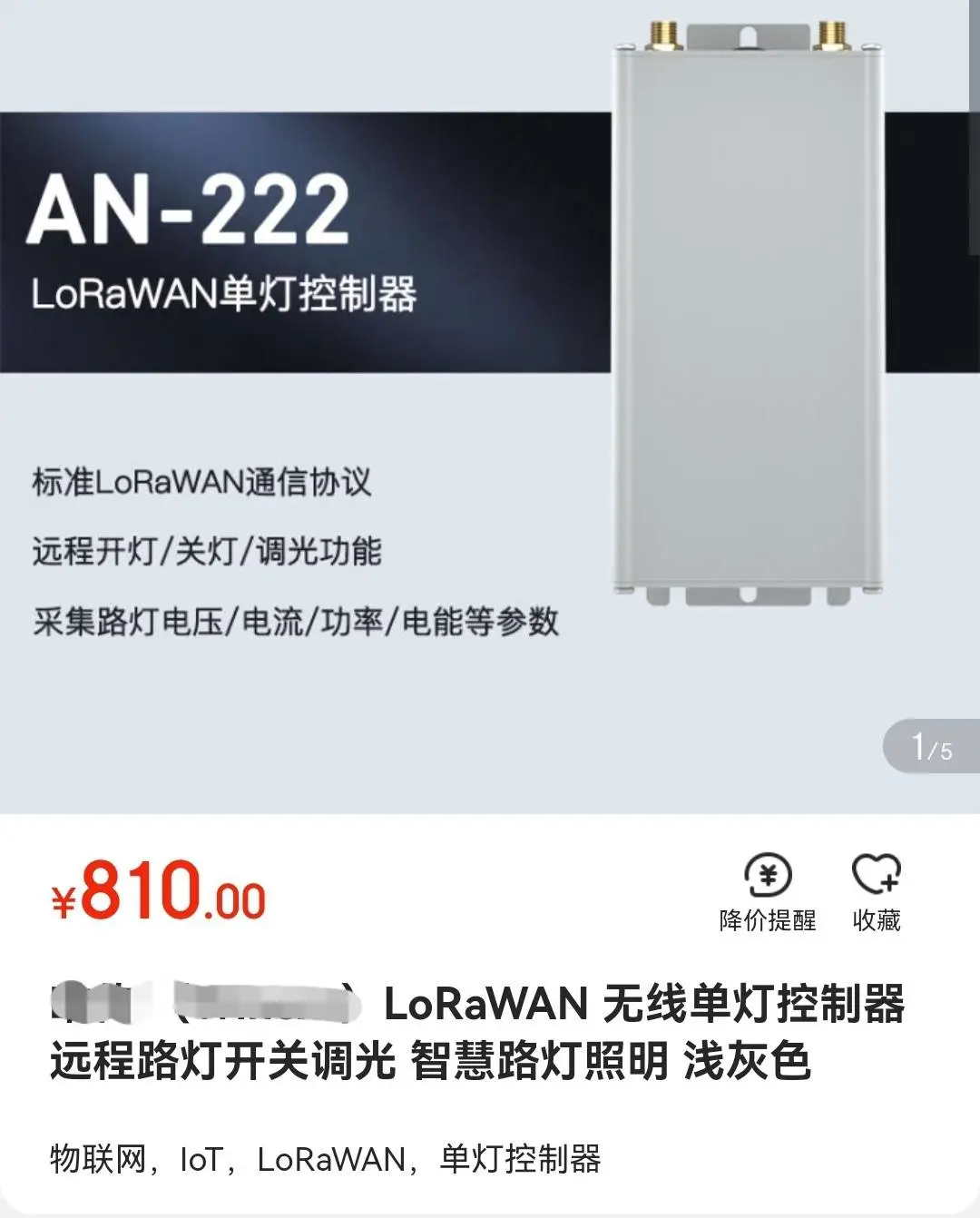 廠商官網(wǎng)顯示,AN222單燈控制器是一款路燈節(jié)能產(chǎn)品,可以對(duì)單盞路燈的電壓、電流、功率、電能等工作參數(shù)進(jìn)行監(jiān)控與采集,同時(shí)具有控制路燈開關(guān)和調(diào)光等功能。該公司電商平臺(tái)的旗艦店中,同型號(hào)產(chǎn)品售價(jià)為810元。