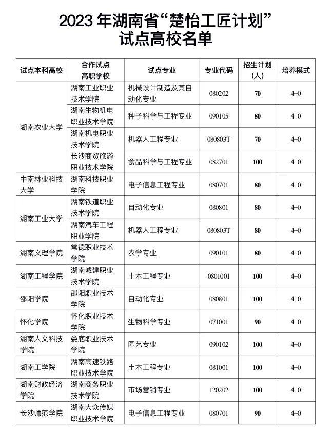 《通知》明確,“楚怡工匠計劃”招生對象為符合我省普通高校招生考試(含普通高考和對口招生考試)報名條件,并已參加我省普通高校招生考試報名的考生。試點學校為省屬有關普通本科高校與高水平高職院校,試點專業主要聚焦服務“三高四新”、鄉村振興戰略的專業。培養模式將采取“4+0”模式(4年均在高職院校培養)或“2+2”模式(本科高校和高職院校各培養2年),畢業后頒發本科院校畢業文憑。2023年,省教育廳遴選湖南農業大學等11所本科高校、湖南工業職業技術學院等15所高職院校進行試點,試點總規模為1320人。