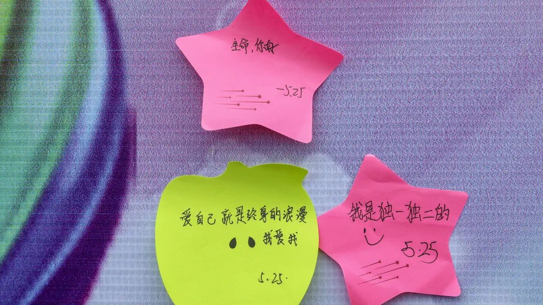 “我是上天的寵兒,我是獨(dú)一無(wú)二的存在,我愛(ài)我自己,我欣賞我自己,我喜歡我自己,我是最棒的!”在心理賦能環(huán)節(jié),同學(xué)們大聲喊出對(duì)自己的肯定。 “愛(ài)自己就是終生浪漫的開(kāi)始。愛(ài)自己要善于發(fā)現(xiàn)自己的優(yōu)點(diǎn),勇于接受自己的缺點(diǎn)?!?78班學(xué)生代表齊奕霖呼吁同學(xué)們熱愛(ài)自己、熱愛(ài)生活,以樂(lè)觀的方式培養(yǎng)良好的心態(tài),及時(shí)快樂(lè)解壓,及時(shí)排解煩惱,活出生命的精彩。 隨后,全體同學(xué)在便簽上寫(xiě)下了對(duì)自己的肯定,并將它們貼在了“生命樹(shù)”上。一張小小的便利貼,記錄下來(lái)的不僅是文字,更是同學(xué)們對(duì)生命的熱愛(ài)和期許。