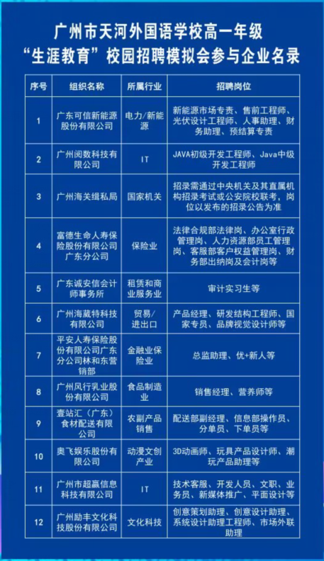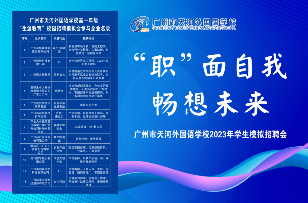 信息時代高速發展,知識迭代更新,社會分工精細,職業是三者交匯的中心,既是生存之道,也是個人價值實現的平臺和需求。中學生正處于一個即將定型又尚未定型的可塑性很強的階段,夢想還是雛形,“理想很飽滿,現實很骨感!”和課堂知識相對社會發展有所滯后都是當下教育必須直面的挑戰,因此職業體驗是中學教育對社會和時代發展的回應,而且中學生萌芽的理想也需要職業體驗來對沖,通過調整自我,更穩健地應對未來挑戰。5月26日下午,學校舉辦“‘職’面自我,暢想未來”——廣州市天河外國語學校“生涯教育”校園模擬招聘會,助力學子們在青春賽道上跑得更堅定、更精彩和更遠闊。