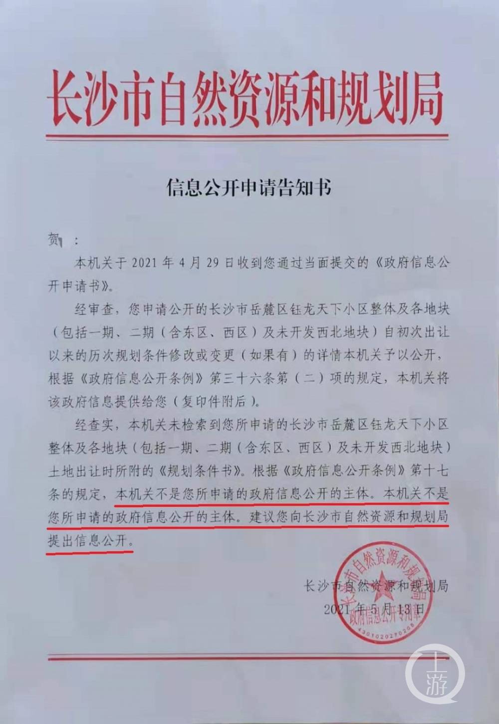 4月29日,有市民提出申請公開長沙市岳麓區鈺龍天下小區整體及各地塊歷次規劃條件修改或變更的詳情。然而,該文件回復,“本機關不是您所申請的政府信息公開的主體”,這句話寫了2遍。同時,文件里還寫到“建議您向長沙市自然資源和規劃局提出信息公開”,而文件的落款和印章正是“長沙市自然資源和規劃局”。既說自己不是信息公開的主體,又讓市民找自己,如此自相矛盾讓人哭笑不得,更傷害了政府權威和公信力。