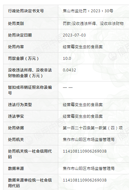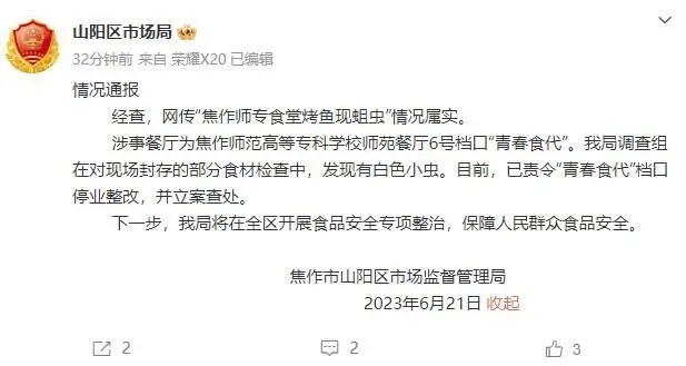 河南省焦作市山陽區市場監督管理局就網傳“焦作師專食堂烤魚現蛆蟲”一事作出行政處罰