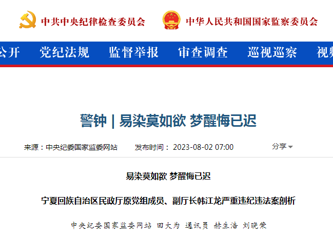 2022年3月,韓江龍因涉嫌嚴重違紀違法,接受寧夏回族自治區紀委監委紀律審查和監察調查。2022年11月,韓江龍被開除黨籍、開除公職,其涉嫌犯罪問題被移送檢察機關依法審查起訴。2022年12月,韓江龍因犯受賄罪,被判處有期徒刑十二年六個月,并處罰金人民幣二百二十萬元。