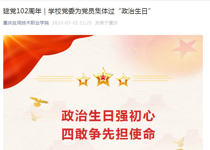 溫初心 鏗鏘誓言鑄忠誠 “我志愿加入中國共產黨,擁護黨的綱領,遵守黨的章程……”全體黨員右拳高擎,莊嚴肅穆地重溫了入黨誓詞。黨員們仿佛又回到了入黨時的情景,用鏗鏘有力的聲音再次向黨作出莊嚴承諾,初心受到洗禮,理想信念更加堅定。 悟初心 使命在肩勇作為 “薛峰同志,2001年6月1日加入中國共產黨,黨齡21年;王書海同志,1996年6月3日加入中國共產黨,黨齡26年……”。工作人員宣讀完畢,王書海同志接過了“政治生日”賀卡、黨徽書簽和生日蛋糕,他反復端詳手里的“政治生日”賀卡,幸福溢于言表,心情久久不能平靜。王書海同志作為集體過“政治生日”黨員里黨齡最長的代表,和大家分享了自己的入黨志愿和入黨歷程,讓大家充分了解了九幾年部隊入黨的情形,讓大家感動萬分。 學校黨委在贈送賀卡的同時還為兩個校企合作單位送學贈書,并勉勵校企合作單位要積極參與學校學習貫徹習近平新時代中國特色社會主義思想主題教育和黨團活動,確保學校和合作單位在各類學習、活動中強化溝通交流、不斷凝聚共識、深化校企合作,合力推進學校人才培養計劃落地生根,合力推進學校走內涵式發道路目標達成。 踐初心 砥礪奮進從頭越 何菲同志再次向集體過“政治生日”的黨員表示熱烈的祝賀。她指出,共產黨員的生命有兩個起點:一個起點拉開人生的序幕,昭示著生命的伊始,記住它是對生命的珍視和珍重,紀念它是對賜予你生命的偉大母親的感動和感恩;另一個起點是政治生日,代表著初心與使命,并讓其奮斗終生!從加入中國共產黨之日起,政治生命就開始了,記住它是對黨的忠誠和信仰,紀念它是每一名共產黨員對黨的感激和感謝。每名黨員都應該牢牢記住這兩個生日。她強調,學校全體黨員干部要永遠不忘初心,堅定信仰;要永遠清白做人,干凈做事;要永遠勇于擔當,敢于斗爭,要永遠保持黨員先進性,在各項工作中爭當先鋒、接續奮斗,在崗位履職盡責上有所作為,在學校事業發展關鍵期有所建樹! “一句誓言、一生作答”!儀式感滿滿的“政治生日”是難得的黨性鍛煉,也是黨員成長進步的新起點。大家紛紛表示,將以踔厲奮發的昂揚姿態,勇毅前行,發揚“四敢”精神,以“敢”字創先、以“干”字爭優,以實干擔當開啟學校高質量發展新篇章。