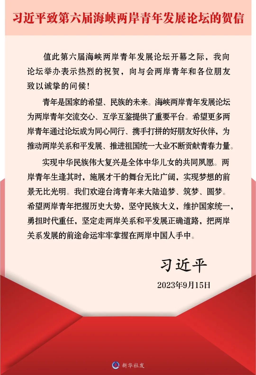 中共中央總書記、國家主席習近平9月15日向第六屆海峽兩岸青年發展論壇致賀信。