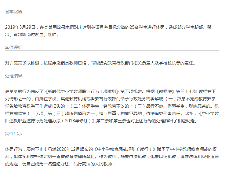 教師許某某體罰學生被辭退、撤銷教師資格,相關人員被追責