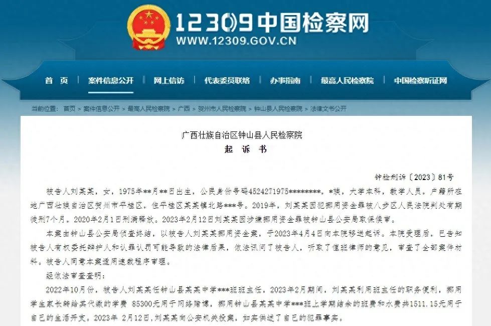 9月14日,廣西壯族自治區鐘山縣人民檢察院公布了一則起訴書,中學女教師挪用學費賭博,并將班費、水費用于個人生活開支,檢方以挪用資金罪提起公訴。
