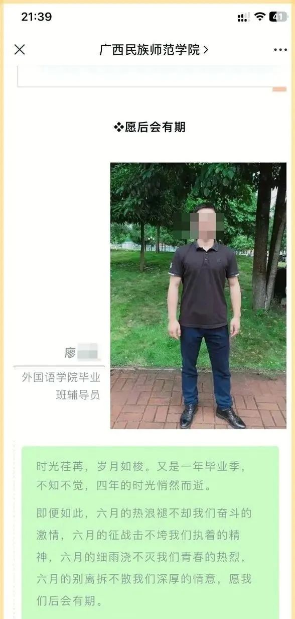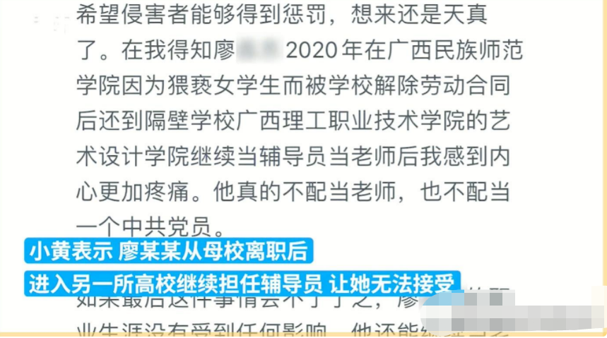 當(dāng)她得知廖先生因?yàn)殁C女學(xué)生的行為,被廣西民族師范學(xué)院解除勞動(dòng)合同,并繼續(xù)在廣西理工職業(yè)技術(shù)學(xué)院的藝術(shù)設(shè)計(jì)學(xué)院擔(dān)任輔導(dǎo)員和教師時(shí),她內(nèi)心感到更加痛苦。