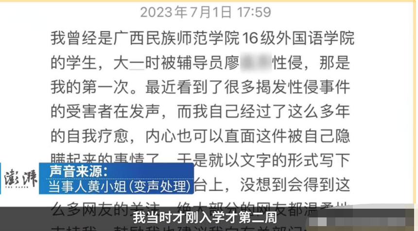 近日,廣西民族師范學(xué)院16級畢業(yè)女大學(xué)生(就讀于外國語學(xué)院)在網(wǎng)絡(luò)平臺(tái)上公開指控,在她大一的時(shí)候遭受了外國語學(xué)院輔導(dǎo)員的性侵 。