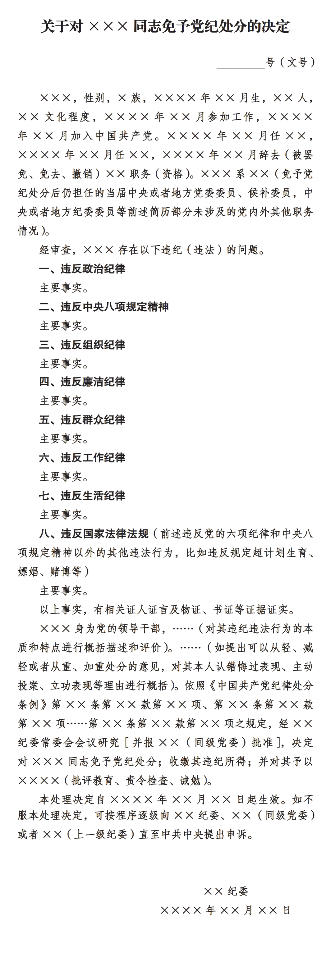 免于黨紀處分決定模板