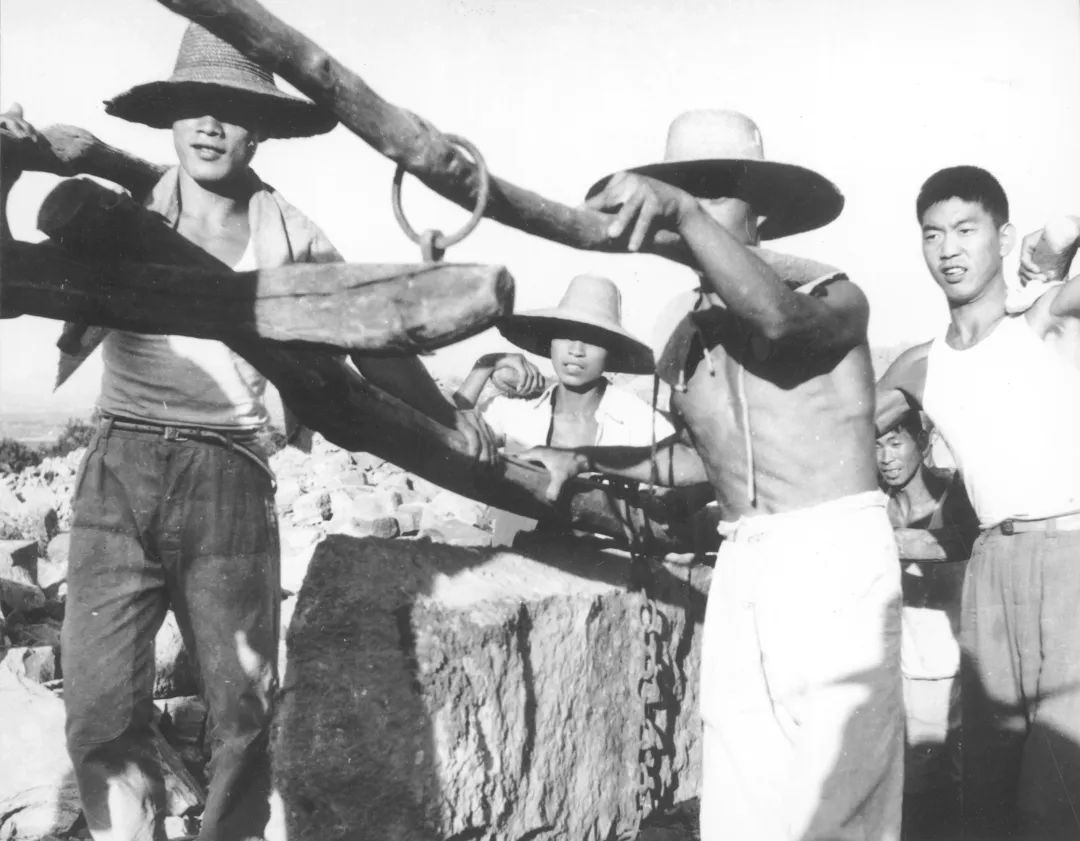 為了按時將料石運送到修渠一線,修渠民眾還摸索出了多種運送石料的方法:小石頭背,大石頭抬,還有四個人抬、六個人抬、八個人抬的方式。特別在修建皇后溝渡槽時,由于要用很大的石料來壓住陣腳,所以就組織起32個人共同抬一塊石料,成為了當(dāng)時修渠工地上一道壯麗的風(fēng)景線。
