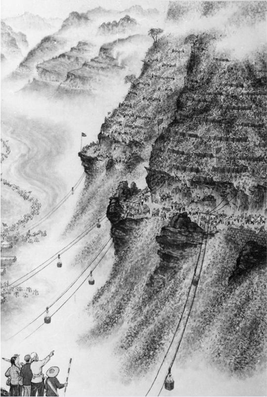 林縣人民憑著重新安排林縣河山的豪邁氣概,讓紅旗渠不斷向前延伸。他們逢山鑿洞、遇溝架橋,在兩座山之間架起一條條空運線,大大提升工程進度。