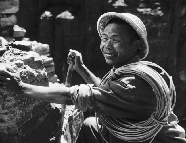 頭戴柳條帽,肩扛大繩子,手握鋼釬,奔走于各個山頭,為修渠大軍炸開道路、炸開作業(yè)平臺,也炸出壘砌渠道的石頭。每一個人都在長時間的作業(yè)中,練就了出色的爆破技術(shù)。平炮、立炮、拐彎炮等,每一種炮從裝藥封口,再到起爆的先后,每一個步驟都會對爆破效果產(chǎn)生很大的影響。他們每天鉆研其中,還研究出一種口子小、肚子大的“瓦窯缸”爆破法,大大加快了鑿洞效率。