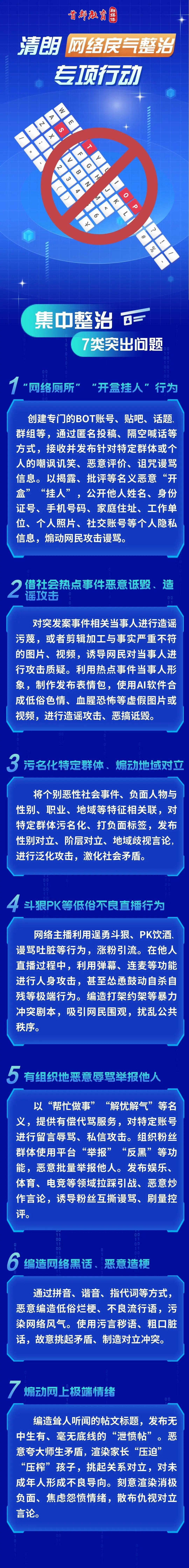 專項(xiàng)行動(dòng)圍繞社交、短視頻、直播等重點(diǎn)平臺(tái)類型,堅(jiān)決打擊以下7方面問題: