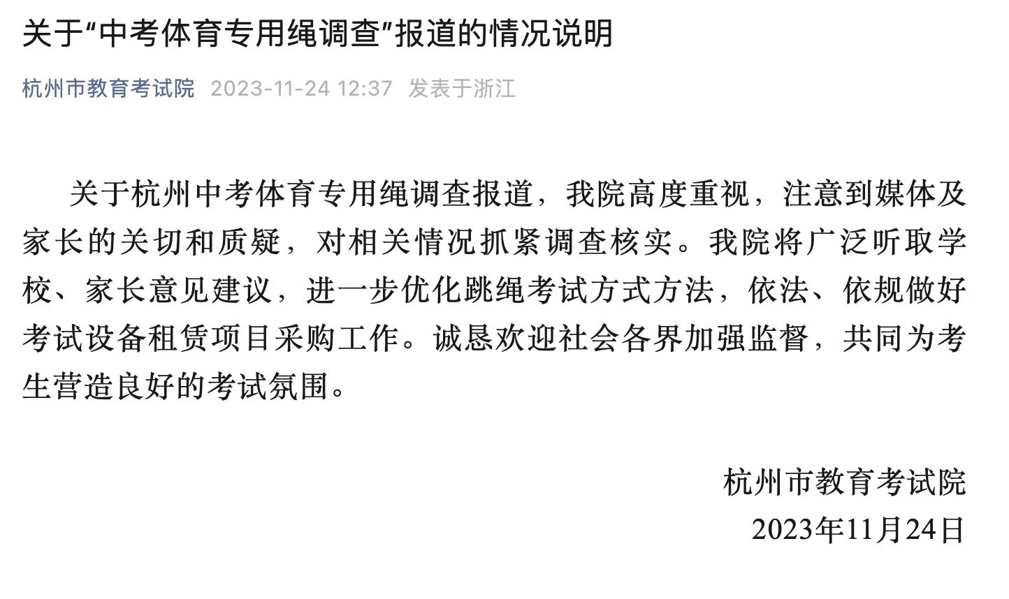 杭州市教育局相關負責人表示:“我們現在也在反思,是不是可以參照其他做得好的地方,完善目前的中考體育跳繩測評方式,包括能否允許學生自帶繩子參加考試,能否選用更多品牌的跳繩設備等,避免給學生和家長帶來不必要的困擾和負擔。”