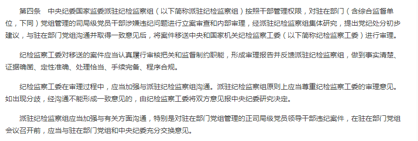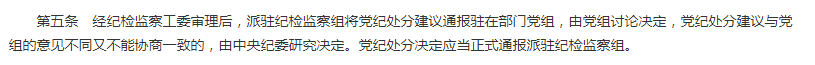 第5條"經紀檢監察工委審理后,派駐紀檢監察組將黨紀處分建議通報駐在部門黨組,由黨組討論決定,黨紀處分建議與黨組的意見不同又不能協商一致的,由中央紀委研究決定。黨紀處分決定應當正式通報派駐紀檢監察組”;